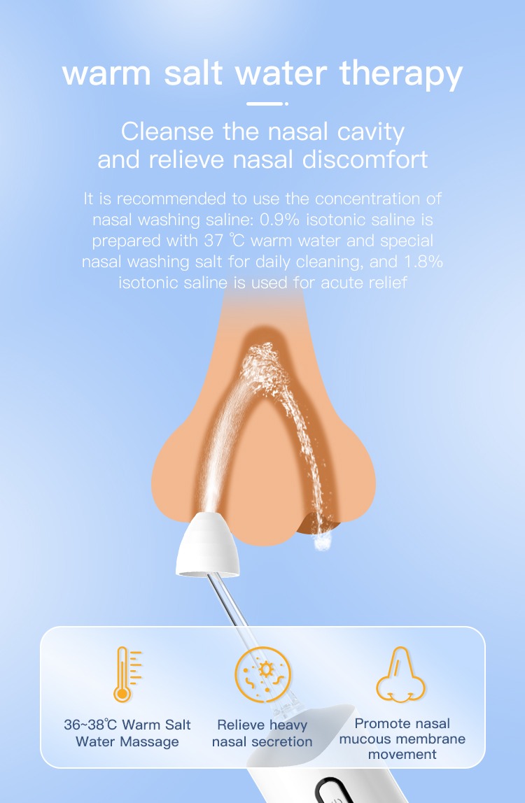 【Standart İpucu】Burun irriqasiyası standart sprey ucuna malikdir. Sprey başlığı burun boşluğunun bütün hissələrinə püskürtülə bilər. Standart nozzle burun keçidlərini yaxalamaq üçün uyğundur. Burun təmizləyicisi kifayət qədər yüngüldür ki, onu səyahətiniz üçün mükəmməl yoldaş olan səyahət çantanıza asanlıqla yerləşdirə bilərsiniz. |