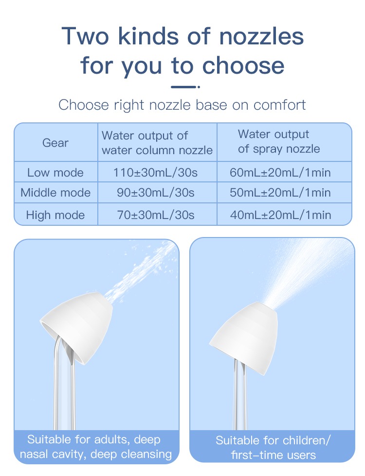 【90 dərəcə fırlanan məsləhətlər】 Burun təmizləyicisinin 360 dərəcə fırlanan ucu dizaynı Neti qabından və ya digər burun yaxalama cihazlarından daha effektivdir. IPX7 suya davamlı dizaynı ilə burun yuyucusu bütün bədən suyunu yaxalamağa imkan verir ki, bu da burun boşluğunun təmizlənməsi və qayğısına qalması daha asan olur. |