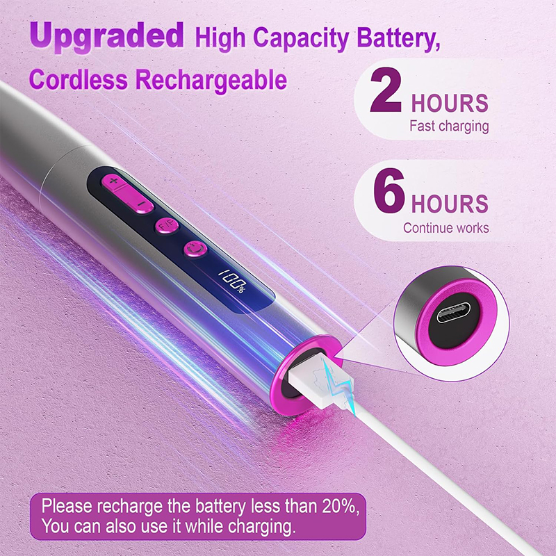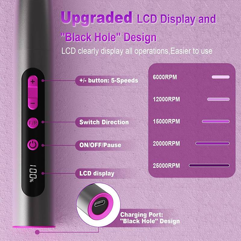 elektrik dırnaq matkap Təkmilləşdirilmiş Yüksək Tutumlu Batareya, 2 saat Sürətli doldurma və 6 saat İşə davam edin. Elektrikli Dırnaq faylı USB enerji adapteriniz, noutbukunuz, mobil enerjiniz və s. üçün uyğundur. Əgər simsiz dırnaq burğunun gücü 20%-dən azdırsa, siz onu şarj edərkən də istifadə edə bilərsiniz.