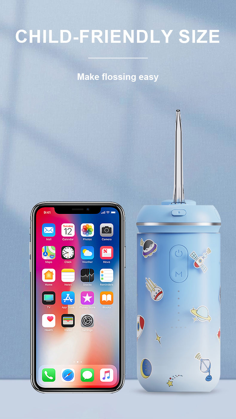 - Easy to Use and Hold for Children: This water dental flosser is designed to fit children's palms, has a smart memory function and simple one-button operation,the back has a concave and convex anti-slip design.The included cute stickers allow kids to customize and decorate the floss with their favorite characters. The water tank capacity is 190 ml, so you don't need to add water frequently during use.