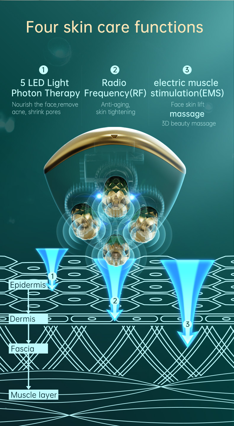 FAYDALARI NƏDİR? -- Gözəllik maşını çoxfunksiyalı qocalma əleyhinə cihazdır və qırmızı/mavi işıq terapiyası ilə Radio Tezliyi (RF) texnologiyası, xətləri və qırışları azaltmaq, dəriyə nüfuzetmə və udma qabiliyyətini yaxşılaşdırmaq üçün EMS və s.