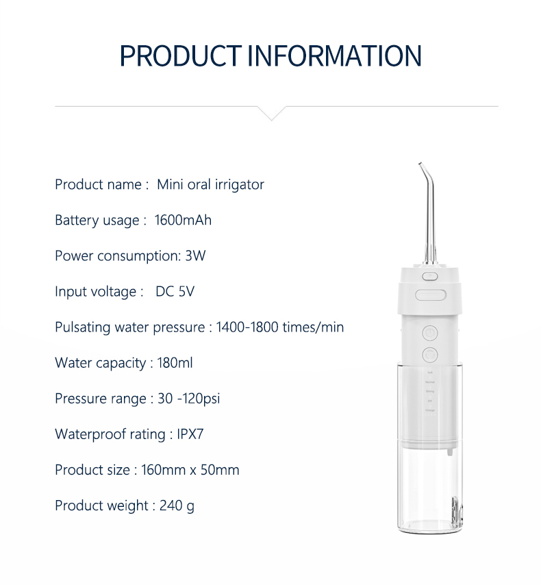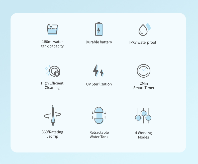 Bu water flosssr dental pick dəqiqədə 1400-1800 dəfə yüksək su təzyiqi impulsları verir və dərin dişlərin təmizlənməsi üçün diş lövhəsinin 99,9%-ni effektiv şəkildə təmizləyir. Bu su diş ipi diş ətini masaj edir, qan dövranını təşviq edir və ağız qoxusu, ortodontik dişlər kimi ağız problemlərini həll edir.