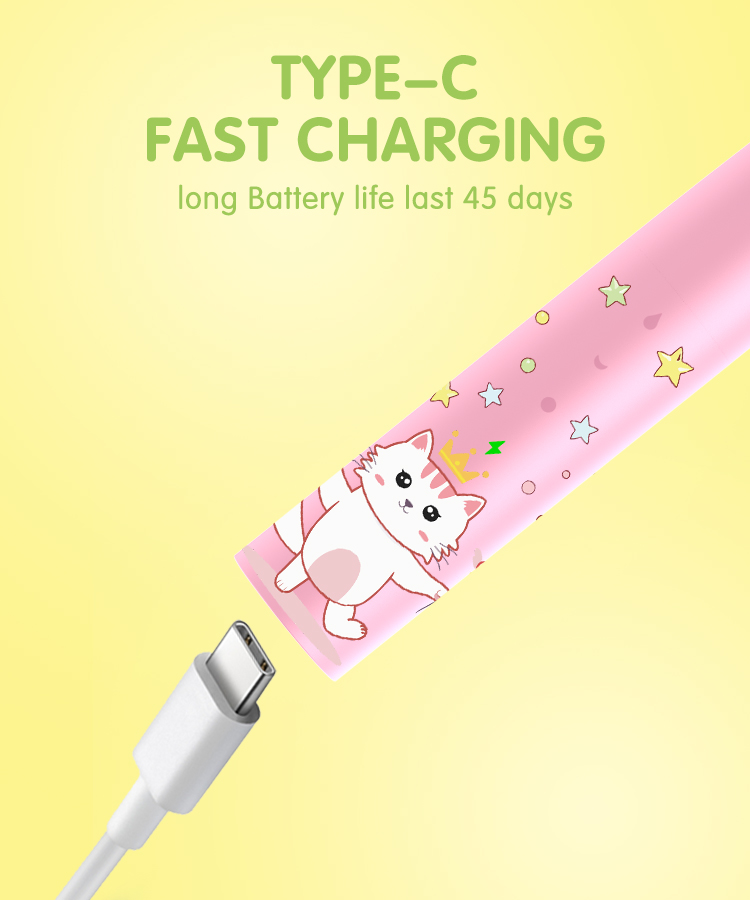 - ƏLAVƏ UZUN YANMA ÖMRÜ: Bu təkrar doldurulan uşaq elektrikli diş fırçası cəmi 3-4 saat şarj tələb edir və 60 günə qədər işləyir. Gündəlik fırçalamaya sadiq qalmaq üçün evdə və səyahət zamanı istifadə etmək asandır.