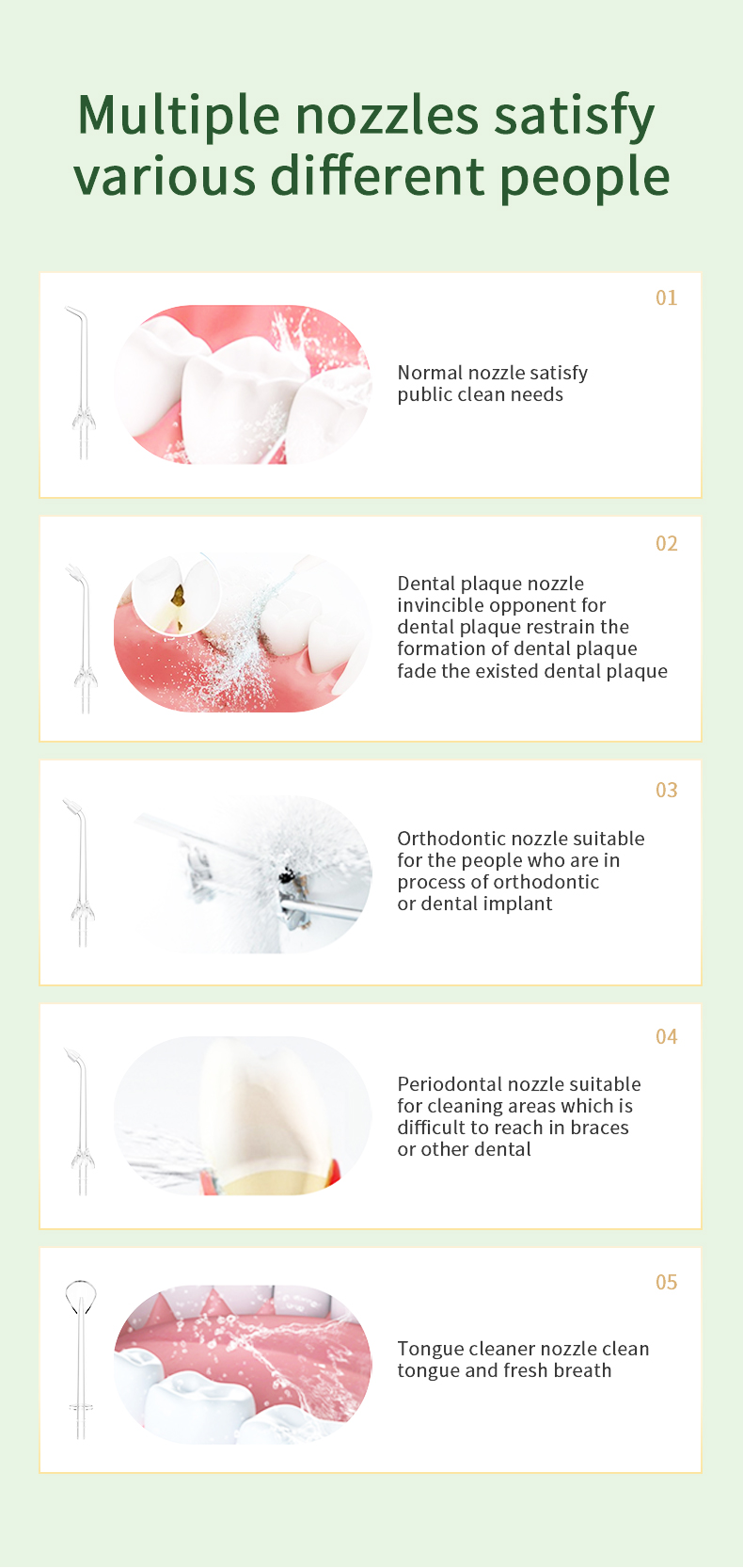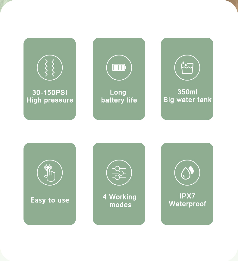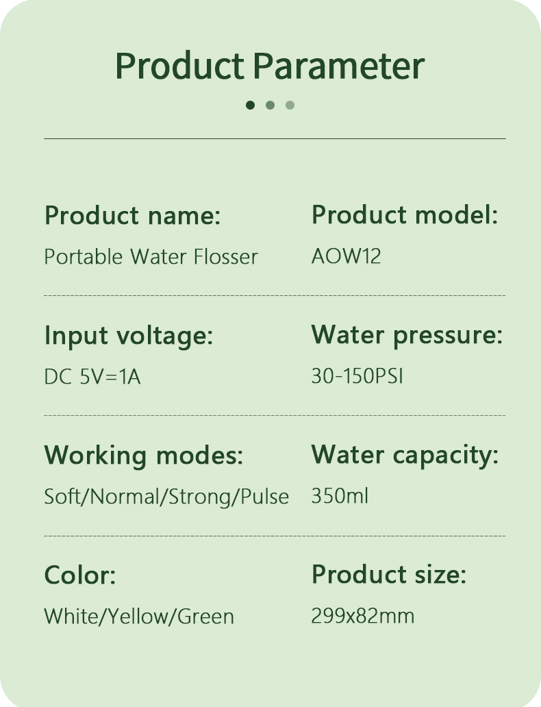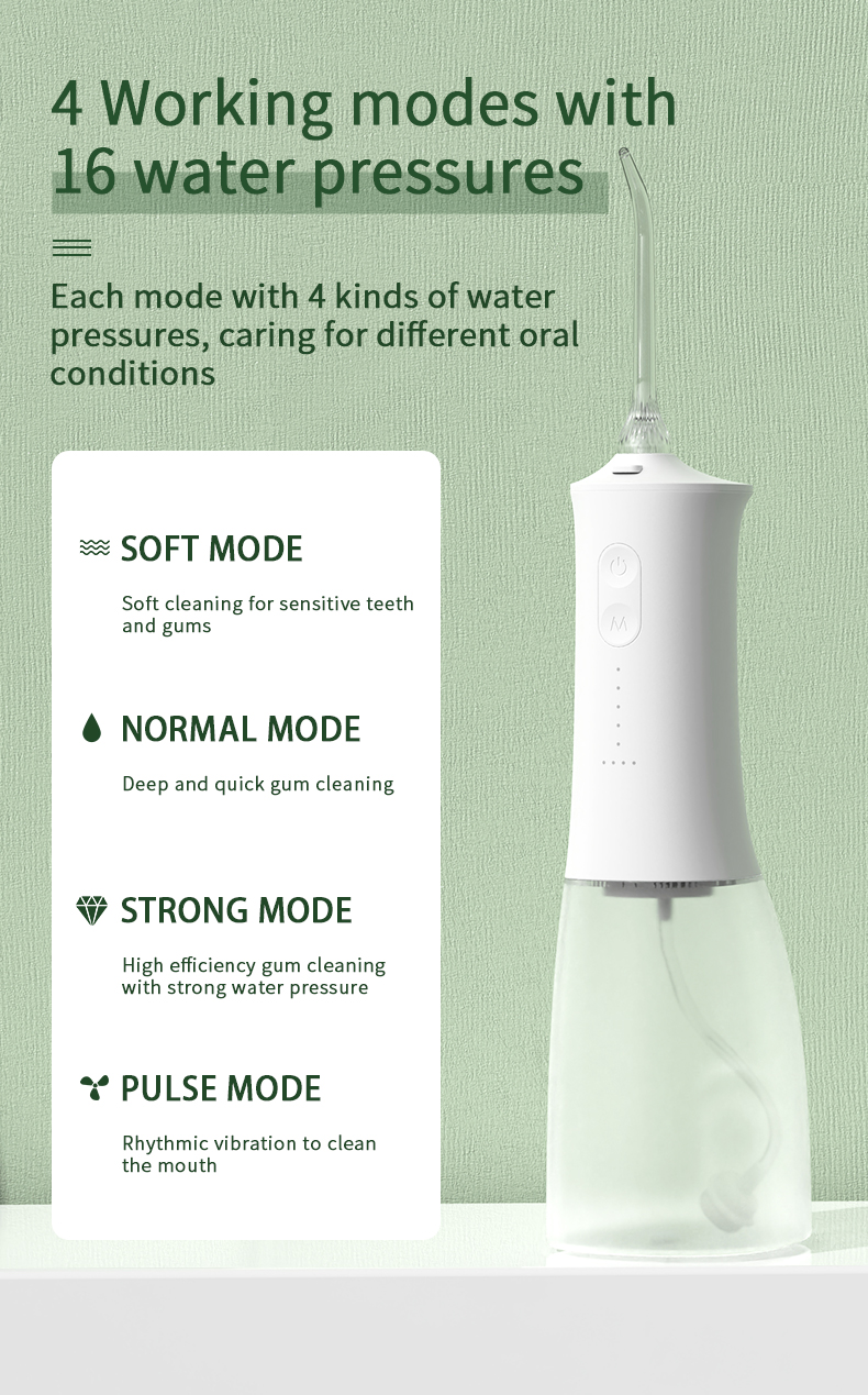 Amerika diş həkimi komandası tərəfindən peşəkar şəkildə qiymətləndirilən diş ipimiz optimal performans və ömrü təmin etməklə yanaşı, 99% müxtəlif yaş qruplarının müxtəlif ehtiyaclarına uyğun beş rahat rejim təqdim edir. Onun erqonomik tutacağı və dəyişdirilə bilən 6 nozzle rahat və çox yönlü təcrübə təmin edir. Doğum günləri, Milad Şükran Günü Sevgililər Atasının Analar Günü və ya yaxınlarınızın ağız sağlamlığına qayğı göstərmək üçün düşünülmüş hədiyyədir.