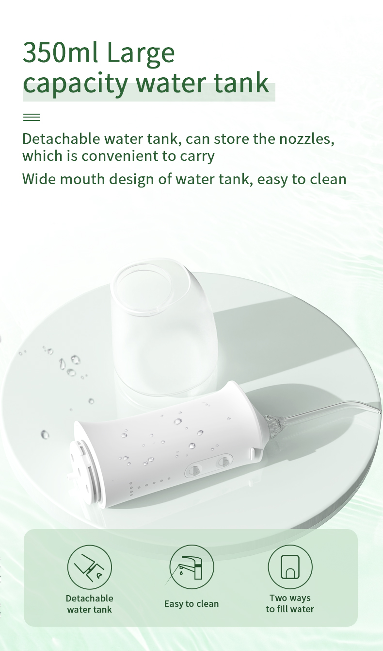 Bu su diş diş ipi təkmilləşdirilmiş 350 ml su çəni ilə digər köhnə modellərdən iki dəfə çoxdur, tez-tez doldurma ehtiyacını aradan qaldırır və ağız boşluğunun təmizlənməsini daha rahat və səmərəli edir.