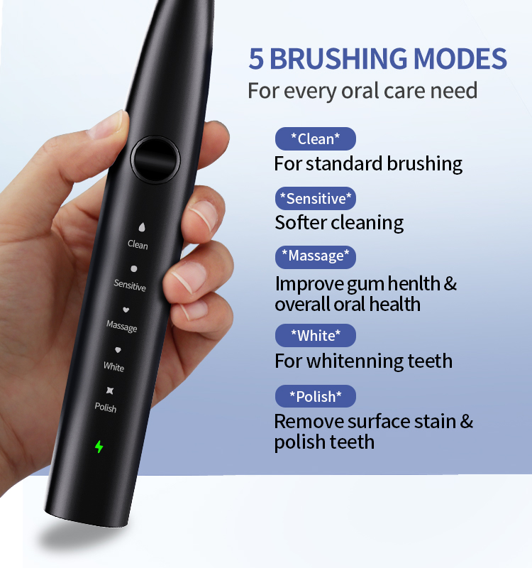 - 5 YÜKSƏK PERFORMANSLI FIRÇA REJİMİ - Təmiz (zərif), Ağ (güclü), Polyak (güclü invert tezliyi), Yumşaq (zərif invert tezliyi) və Həssas (yumşaq) diş ətinin müxtəlif vəziyyətlərinə uyğundur, beləliklə, müxtəlif rejimləri seçə bilərsiniz. seçimlərinizə və diş həkiminin tövsiyələrinə uyğun olaraq.